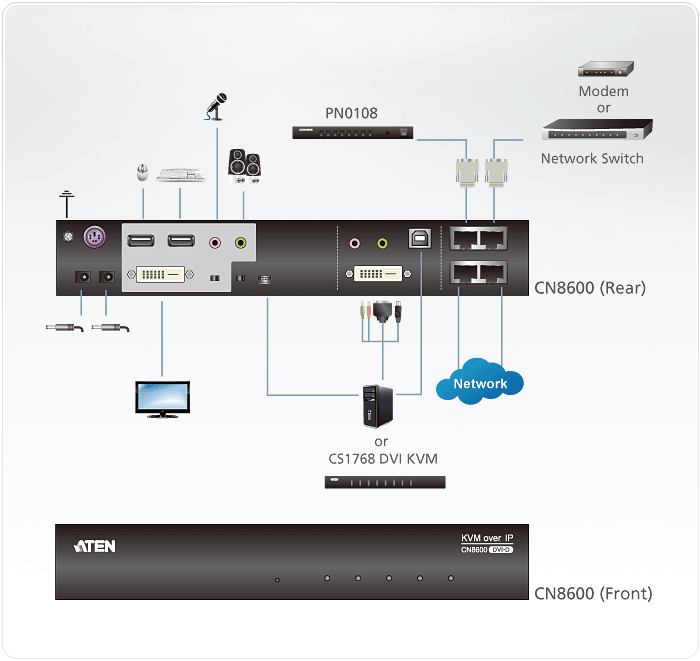 CN8600 DVI KVM over IP to ekonomiczne urządzenie klasy „over IP” (zapewniające transmisję za pośrednictwem protokołu IP). Pozwala uzyskiwać dostęp do materiałów wizyjnych i dźwiękowych oraz wirtualnych nośników poprzez zdalne kontrolowanie komputera lub stacji roboczej. CN8600 realizuje funkcję „over IP” przez połączenie z kompatybilnym przełącznikiem ATEN DVI KVM i/lub konsolą LCD, np. CS1768 (8-portowy przełącznik USB DVI KVM) lub CL6700 (konsola DVI LCD).