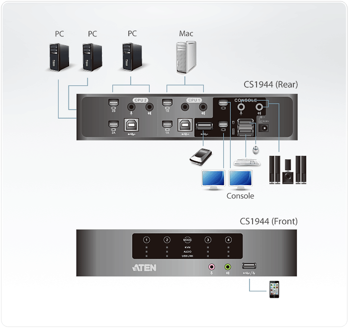 CS1944 stanowi ulepszenie poprzednich modeli KVM poprzez dodanie najnowszych złączy Mini-DisplayPort i Mini-TOSLINK. Może on także przesyłać cyfrowe sygnały wideo i audio o rozdzielczości HD, dając żywe obrazy i dźwięk przestrzenny dzięki złączom SPDIF.