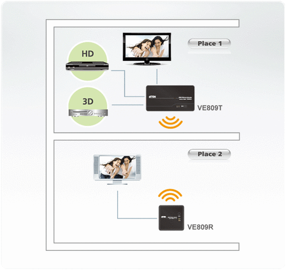 Bezprzewodowy przedłużacz HDMI VE809 umożliwia umieszczenie posiadanego wyświetlacza HDMI w odległości do 30 m* od źródła sygnału HDMI przy wykorzystaniu technologii bezprzewodowej. Zapewnia łatwe bezprzewodowe połączenie dwóch urządzeń HDMI do telewizora HD z kryształowo czystą jakością obrazu, umożliwiając transmisję sygnału wideo w trybie Full 1080p, z wykorzystaniem 5.1 kanałowego cyfrowego sygnału audio i technologii 3D. Pilot na podczerwień umożliwia zdalne przełączanie między źródłowymi urządzeniami HDMI od strony odbiornika, a ponadto umożliwia równoczesne oglądanie obrazu na lokalnym i bezprzewodowo połączonym telewizorze HD. Przedłużacz VE809 składa się z bezprzewodowego nadajnika i odbiornika audio/wideo. Umożliwia skonsolidowanie posiadanych elektronicznych urządzeń HDMI i używanie przedłużacza VE809 jako bezprzewodowego 2-portowego przełącznika HDMI do podłączania zdalnych urządzeń, takich jak odtwarzacze Blu-ray i dekodery HD telewizji kablowej w celu zaprojektowania dostosowanej do własnych potrzeby bezprzewodowej przestrzeni rozrywkowej.