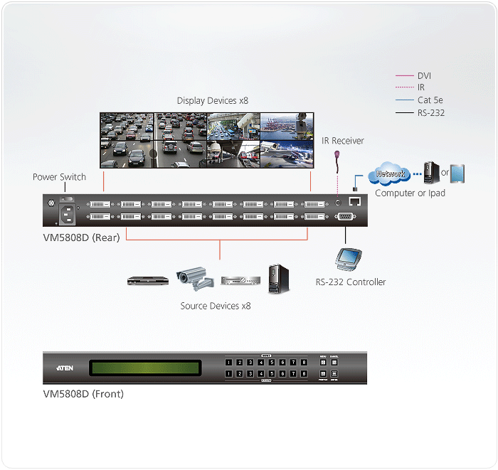 W celu uniknięcia niestabilności sygnału, pogorszenia jakości oraz innych czynników związanych z konwerterami interfejsów, firma ATEN stworzyła VM5808D: Płynnie działający przełącznik matrycowy dla sygnałów DVI, który oferuje łatwy i osiągalny sposób przeprowadzenia dowolnych 8 źródłowych sygnałów DVI do dowolnych 8 wyświetlaczy DVI.