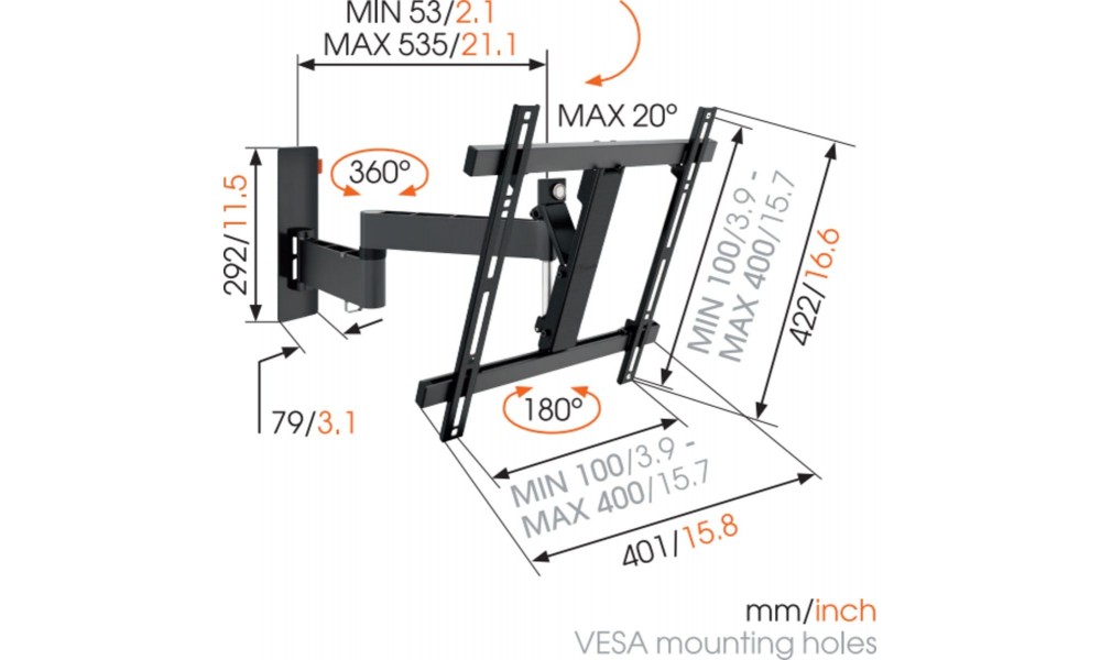 Mocowanie do ekranu w systemie VESA: 100x100, 100x200, 200x200, 300x300, 400x400 mm.